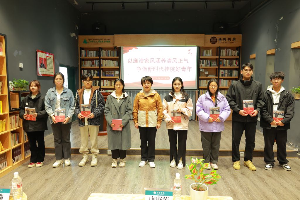 康庚莲以“以廉洁家风涵养清风正气,争做新时代桂院好青年”为主题进行了分享。在以史为鉴,用正反典型为镜思齐自省环节,她以周敦颐《爱莲说》为例,勉励广大青年师生做如荷花般绽放的新时代青年;在向学向善,以清廉家风为训涵养正气部分,她以毛泽东的“家风三原则”为例,呼吁广大青年师生以良好家风塑造优良作风,并积极投身到日常工作的实践中;在自律自强,挺膺担当争做新时代桂院好青年篇章,她以“时代楷模”黄文秀为例,号召广大青年师生要敢于担当、奋勇拼搏,为桂院的发展谱写了新时代的青春之歌。