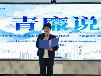 12月9日下午,校纪委、校团委共同举办的“青廉说”演讲比赛在至善讲堂举办。校纪委书记康庚莲,副校长杨庆庆、蒋毅出席活动,学校办公室、校团委、马克思主义学院相关负责人,各党总支书记、校纪委委员、各党总支纪检委员和师生代表180余人参加活动。