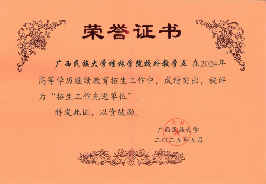 近日,广西民族大学在相思湖校区召开2025年高等学历继续教育工作会议,我校作为广西民族大学桂林学院校外教学点,在2024年高等学历继续教育招生工作中,以招生第一名的成绩在全区众多校外教学点中脱颖而出,被评为“招生工作先进单位”。