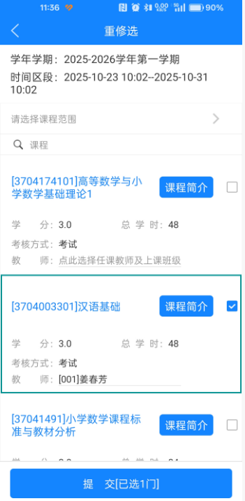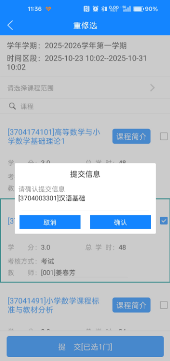 2. 选择上课班级,在复选框打勾,然后点确定,确定后提交重新修读课程,即完成重新修读选课。