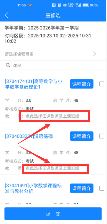 (四)选择本学期重新修读课程,然后选择重新修读课程的班级,在“选择标记”中点选,并点“提交”,确认选择重新修读课程。