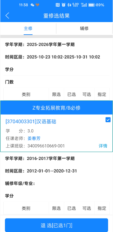 点击“退选”按钮,会弹出一个弹框点击“确定”按钮,完成退课。