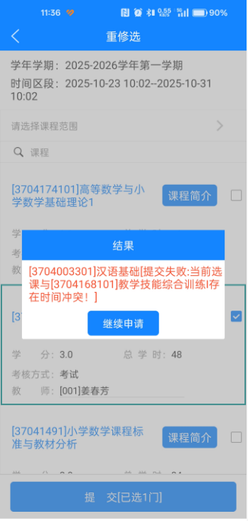 3. 选择重新修读课程时,请优先结合个人课表中的空闲时段进行选课以尽量避免时间冲突;若所选重新修读课程与现有课程存在时间冲突,可点击 “继续申请” 提交重新修读申请,申请提交成功后,需及时与该重新修读课程所属开课学院的教学秘书取得联系,按要求办理重新修读课程免听手续。