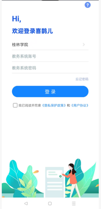 在首次登录喜鹊儿时必须选择教务账号登录,使用的账号密码为学校默认使用的学生的教务账号密码;学生的账号为学号,初始密码为:身份证后六位