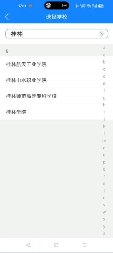 5.3.输入对应学校关键字,即可看到相关学校列表,也可直接在右侧选择学校开头文字拼音首字母,点击学校名称完成选择。