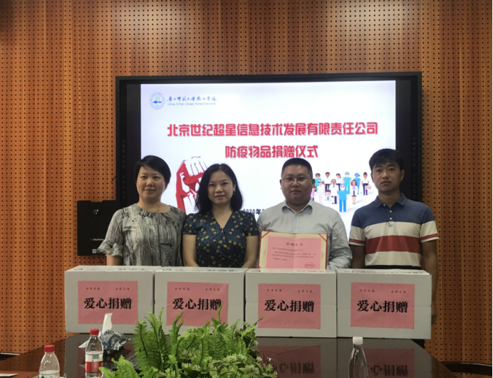 捐赠仪式上,校领导对北京世纪超星信息技术发展有限责任公司一行的到来表示热烈的欢迎和衷心的感谢。校总会计师祝芸芸代表学校向对方颁发了捐赠证书,后勤保卫处、财务资产处代表学校在校医务室接受了捐赠物资。超星公司周杨经理表示,学校正处于全面开学复工的关键时期,疫情防控任务艰巨,作为学校长期友好合作单位,希望通过捐赠防疫物资为漓院疫情防控工作贡献一份力量。
