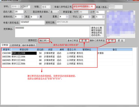 (4)在临时教室申请界面,如实填写完毕后,点击“查询空教室”,选择合适教室后点击“安排”和“打印”;