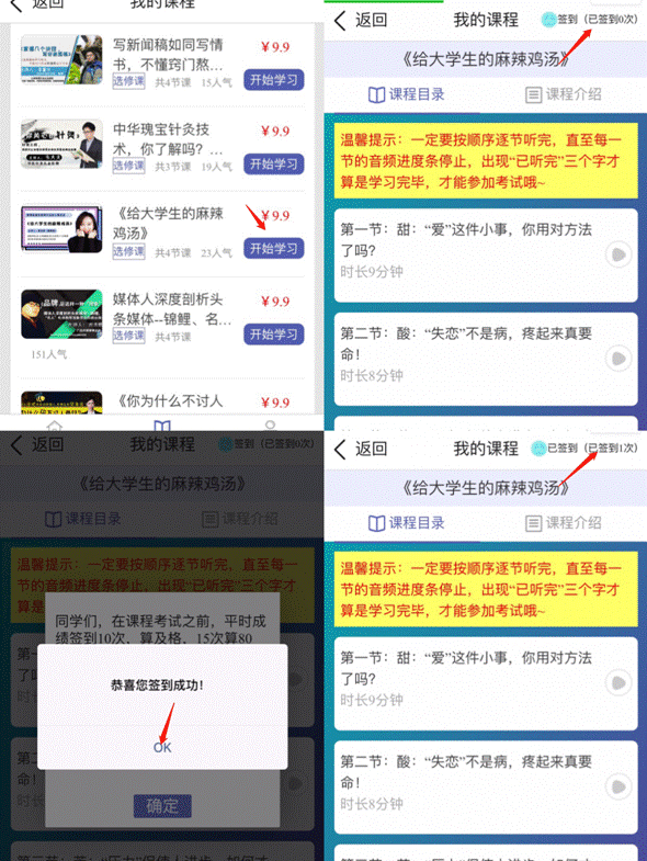 点开【我的课程】,点击【开始学习】,点击右上角的【签到】,签到成功。
