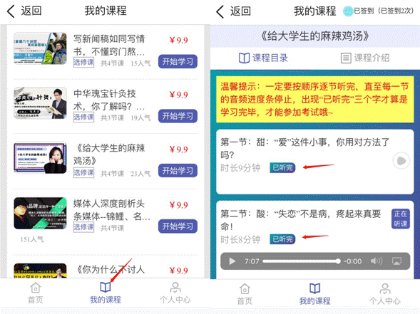 注意:收听完所有课程才能在规定的时间内出现试题参加考试,收听学习完成的标志是音频界面会出现【已听完】三个字。