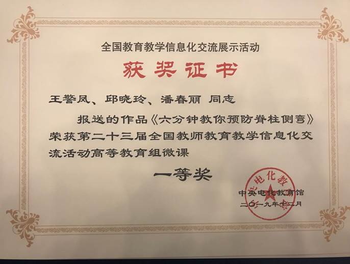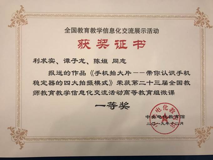 12月6日,由中央电教馆主办的第二十三届全国教师教育教学信息化交流活动在北京落下帷幕。经过校赛、区赛、国赛的层层遴选,我校王警凤老师《六分钟教你预防脊柱侧弯》、利求实老师《手机拍大片——带你认识手机稳定器的四大拍摄模式》的微课作品参加了本次交流活动,并喜获全国一等奖。