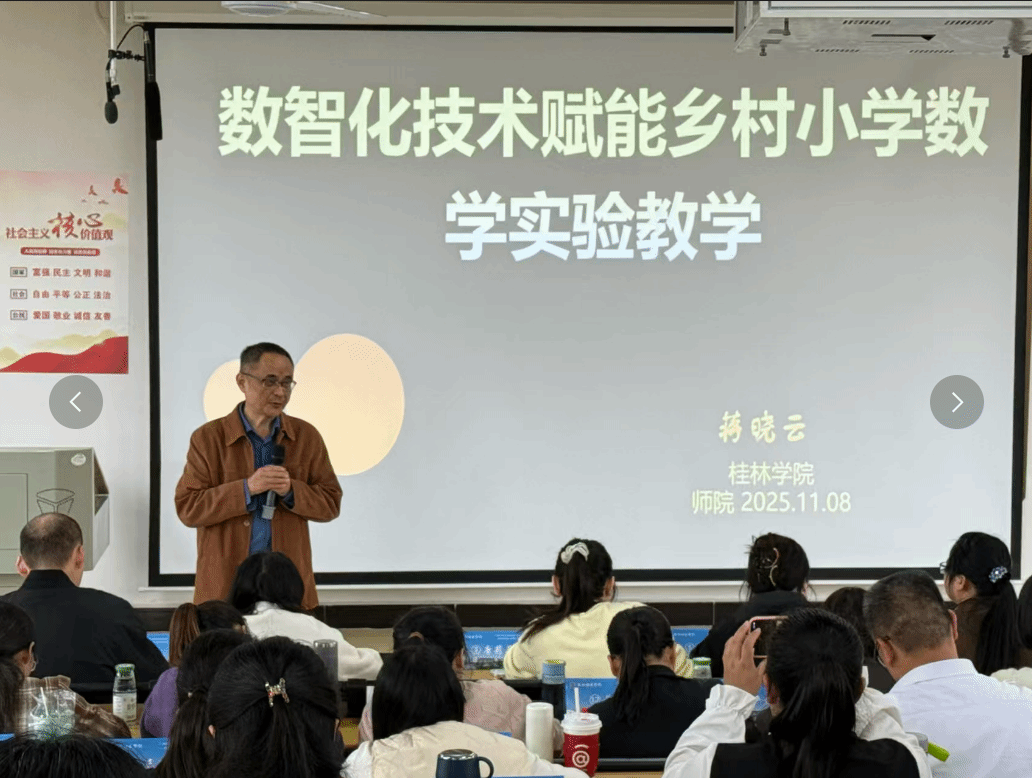 近日,广西2025年“国培计划”桂林市统筹项目——桂林市农村小学数学骨干教师培训在桂林市顺利开展。小学教育专业蒋晓云教授作为主讲教师、评审专家受邀出席,与一线名师共同对学员的说课表现进行专业点评与指导。蒋晓云教授长期关注并深入研究小学数学教育的前沿动态与改革实践,他在讲课过程中,特别强调了在“AI+教育”背景下,教师如何有效利用信息技术优化实验教学,以及如何在教学实践中扎实落实数学学科核心素养,其精准的洞察与中肯的建议,赢得了在场学员与同仁的高度认可。此外,他还担任了本次活动钟说课展示环节的评委,本次说课展示以小组为单位,由各组推选优秀学员代表登台,围绕集体备课内容进行说课演示。活动现场气氛热烈,学员们充分展示了在集中研修与跟岗学习阶段所吸收的先进理念与教学方法。蒋晓云教授与其他评委一道,从教学设计、目标落实、核心素养体现、课堂实施可行性以及AI与数字技术融合等多个维度,对学员的表现进行了细致深入的点评与专业指导。小学教育教师的参与,充分体现了桂林学院小学教育专业服务地方基础教育、推动教师专业发展的责任担当,也展现了高校与一线小学在教师培养培训领域的深度协同。此次担任国培计划评委,不仅是其个人学术影响力的体现,更是桂林学院小学教育专业支持地方师资队伍建设、助力乡村教育振兴的生动实践。