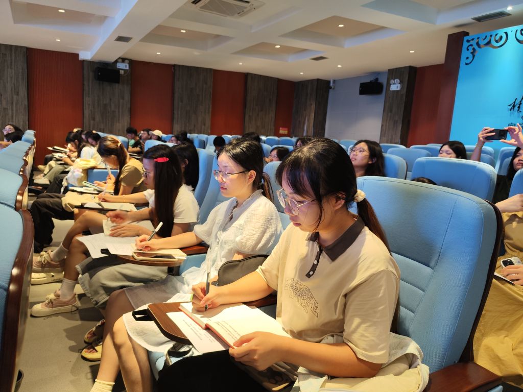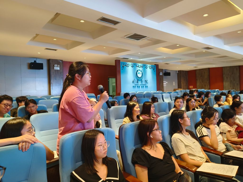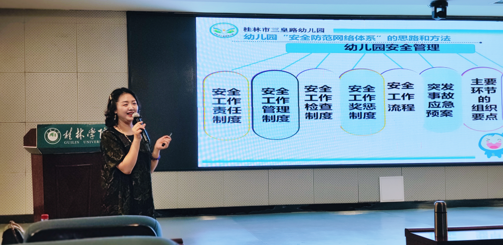 为落实关于共建教师教育改革试验校“请进来”的工作要求,进一步提升我校学前教育专业学生专业认知和专业能力,6月17日晚,我院邀请桂林市三皇路幼儿园卿薇园长在至善讲堂厅为2022级学前教育专业学生开展了“《学前教育法》颁布背景下幼儿园一日活动的安全防范实践”的专题讲座。同时,学前教育教研室教师结合《幼儿园管理》课程内容,对幼儿园安全管理进行了知识链接。