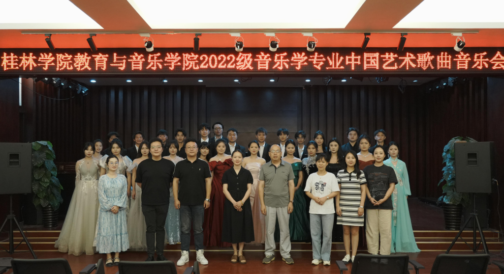 6月25日晚,桂林学院小音乐厅内诗韵悠扬、情感涌动,由教育与音乐学院主办,音乐表演教研室承办的2022级音乐学中国艺术歌曲音乐会拉开帷幕。教育与音乐学院党总支书记周杰、副书记宋丹阳,副院长李安然,以及音乐专业任课教师和辅导员老师参与。
