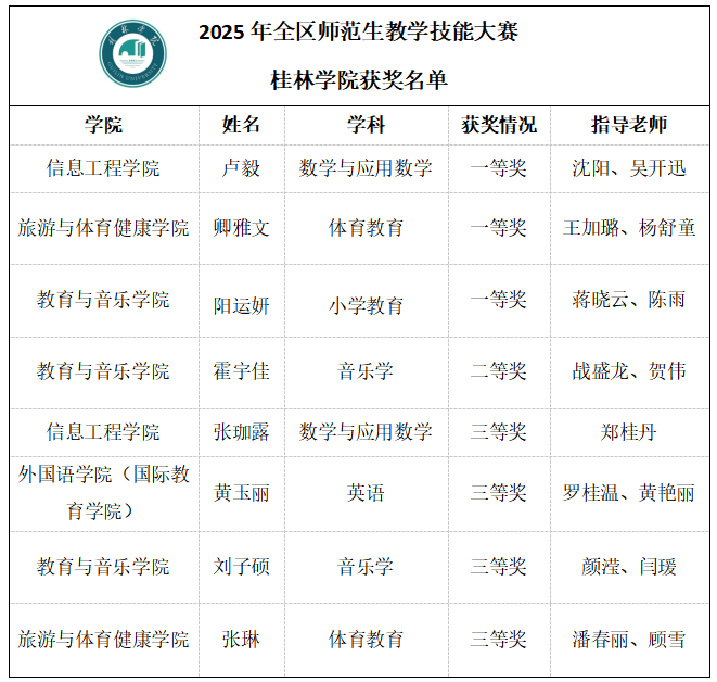 桂林学院高度重视师范生的培养,将学习贯彻教育家精神作为师范生师德教育的首要任务和重点内容,致力于培养政治素质过硬、专业素养精良、学科能力突出、育人情怀深厚的师范专业人才。本届比赛成绩充分体现了桂林学院师范生的扎实水平和核心素养能力,是学校长期以来聚焦教师教育、致力于师范生培养、持续深化教育教学改革的集中体现。