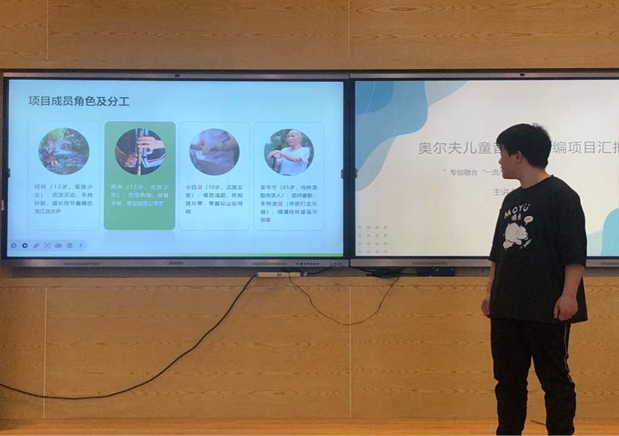 活动中,学生团队对《摇妹新冒险》《月亮是谁的》《漓江歌谣韵》三个奥尔夫儿童音乐剧创编项目策划及完成进度作出汇报,并展演剧目中的第一幕,其中《摇妹新冒险》剧目以桂林童谣及地方文化创新为背景,展示了富有创意的音乐剧项目。该作品巧妙融合奥尔夫音乐教育理念,通过角色冒险传递爱与责任,将品德教育、艺术感知与文化传承有机结合,充分契合幼儿认知特点。《月亮是谁的》结合幼儿认知水平,培养幼儿互爱、懂爱的社会交往能力。《漓江歌谣韵》通过数字赋能,在秦爷爷说唱桂林童谣时,同步展示动画字幕+肢体动作,辅助幼儿理解方言歌词,自然渗透地域文化。谢尧校长与黄春丽园长对学生项目的教育价值与创新性给予高度评价,认为其充分体现了课程的专业性、实践性与文化传承特色