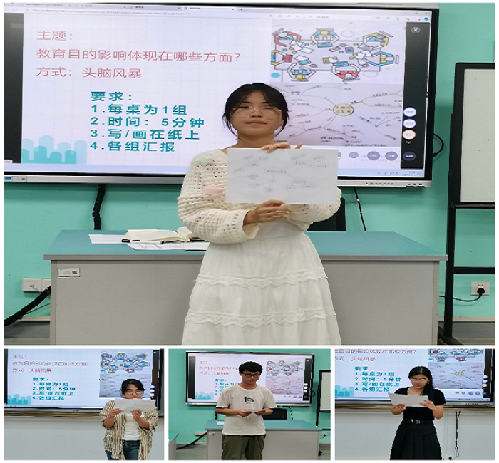 首先,课程团队按照“教育概念、教育功能、教育发展、教育主体”四个模块重塑教学内容,分析教学知识点与能力培养对应关系,以典型案例、教育现象等作为教育事实导入,结合学生个人成长和教育经历, 让学生置身于符合自身实际的情境中,开展“教育现象导入(是什么)——分析教育问题(为什么)——提出教育策略(怎么做)”的循序渐进式学习,引导学生进行基于理解的深度学习。课程设置“不同历史时期的教育有哪些特征”“教育如何影响你的发展”“教育目的影响体现在哪些方面”“小学课程的现实与理想”等作为版块主题,引发学生结合中学历史知识、个人生活和教育经验进行学习和思考,课堂根据教育理论进行表达和展示,培养学生养成教育理论联系实际、关注教育现象的学习习惯。