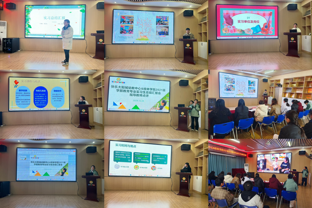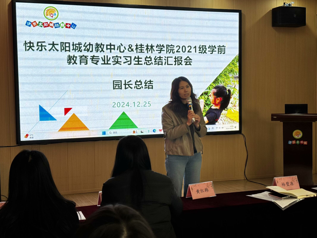 为深入了解学前教育专业学生的实习成长情况,强化与实习基地的合作交流,12月25日,教育学院黄红韩、廖宁燕、容思慧、赵红四位老师赴雁山快乐太阳城幼教中心组织实习总结汇报会。