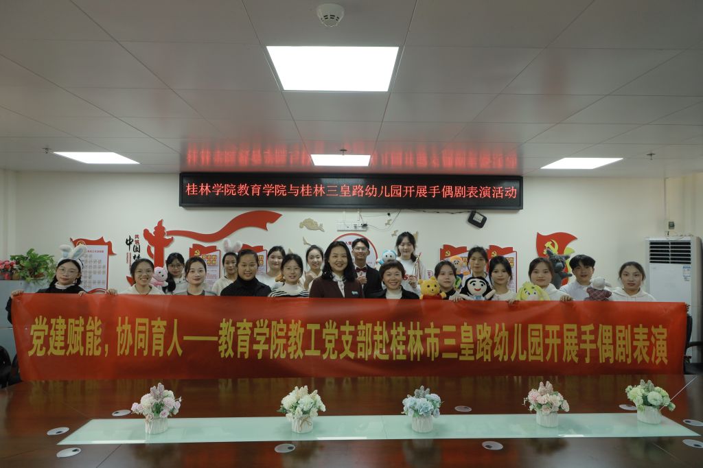 为了发挥教工党支部在人才培养中的作用,进一步推进学前教育民办高校优势特色专业建设,搭建“高校教师+幼儿园教师+学前教育师范生”协同育人平台,2024年12月4日上午,教育学院教工党支部委员、学前教育专业教师黄红韩、党总支组织委员余华带领2022级学前教育专业学生赴学校教师教育改革实验校——桂林市三皇幼儿园开展一场别开生面手偶剧表演。