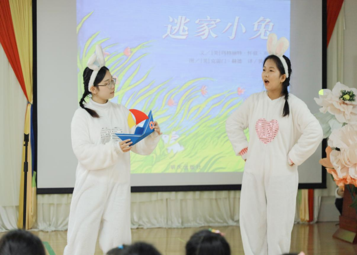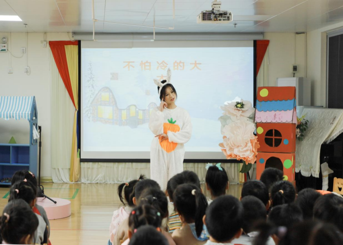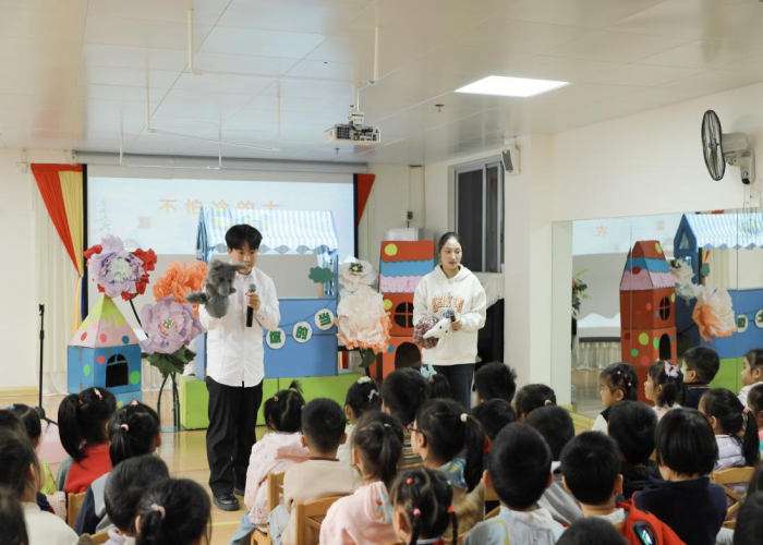 接着,我院学生团队先后带来了《有责任心的小豆》《不上你的当》两个手偶剧,同学们以生动活泼的手偶表演向幼儿传递正能量,教会幼儿在日常生活中要有担当、责任心,不能轻易相信陌生人。同时,我院学生还带来了《不怕冷的大衣》《逃家小兔》两个讲故事表演,学生将富有教育意义的故事带进教室,生动形象地展现了角色的情感与成长。无论是手偶剧还是讲故事表演,故事角色都在舞台上活灵活现,吸引孩子们沉浸其中,赢得了他们热烈地掌声和欢笑。每一个故事不仅充满趣味性,同时也潜移默化地传递了正直、勇敢、有责任心等积极的价值观。表演结束后,我院学生与幼儿进行互动,通过提问的方式让幼儿重温故事,孩子们除了体验到快乐,还在观摩表演的过程中学到了知识。