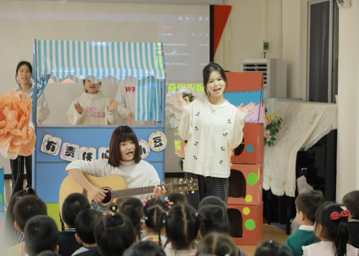 表演开始,学前教育专业学生林子钤用吉他弹奏《勇气大爆发》作为暖场音乐,学生与幼儿一起跟着音乐旋律演唱,现场十分活跃。