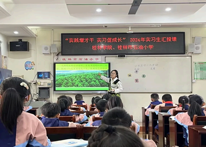 为深度了解实习生阶段性实习情况,优化后一阶段的实习任务,进一步加强学校实习工作,促进实践教学质量提升,11月26日上午,教育学院在石油小学开展2021级小学教育专业“实践增才干,实习促成长”的实习中期汇报课教学展示。桂林学院教务与产教融合处副处长及实习指导老师、石油小学校长谢颖华、全体实习生共同参与。