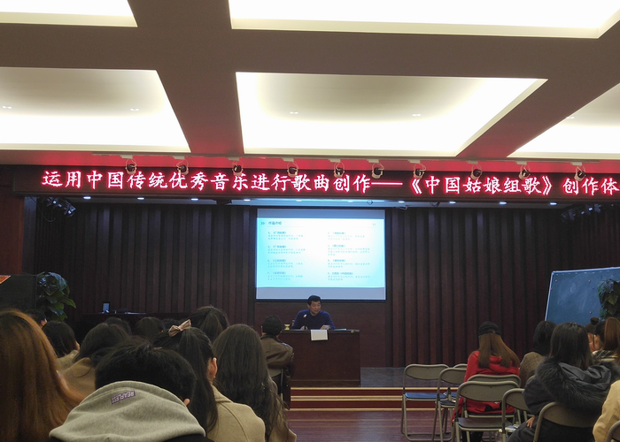 为提高我院音乐学专业师生的综合能力发展,加快音乐学专业转型步伐,提升我院国际化与民族化相结合的视野,结合我院特色专业教育,增强教师团队理论创作与实践能力,12月26日星期三下午14:30,特邀请著名作曲家、音像出版专家李家全教授为我院音乐学专业师生开展“运用中国优秀音乐进行歌曲创作——《中国姑娘组歌》创作体会”的学术讲座。讲座由教育与音乐学院院长彭超教授主持,音乐学专业全体教师、作曲主修学生及16级音乐学教育与非教育专业全体学生专业师生近150人到场参加本次讲座。