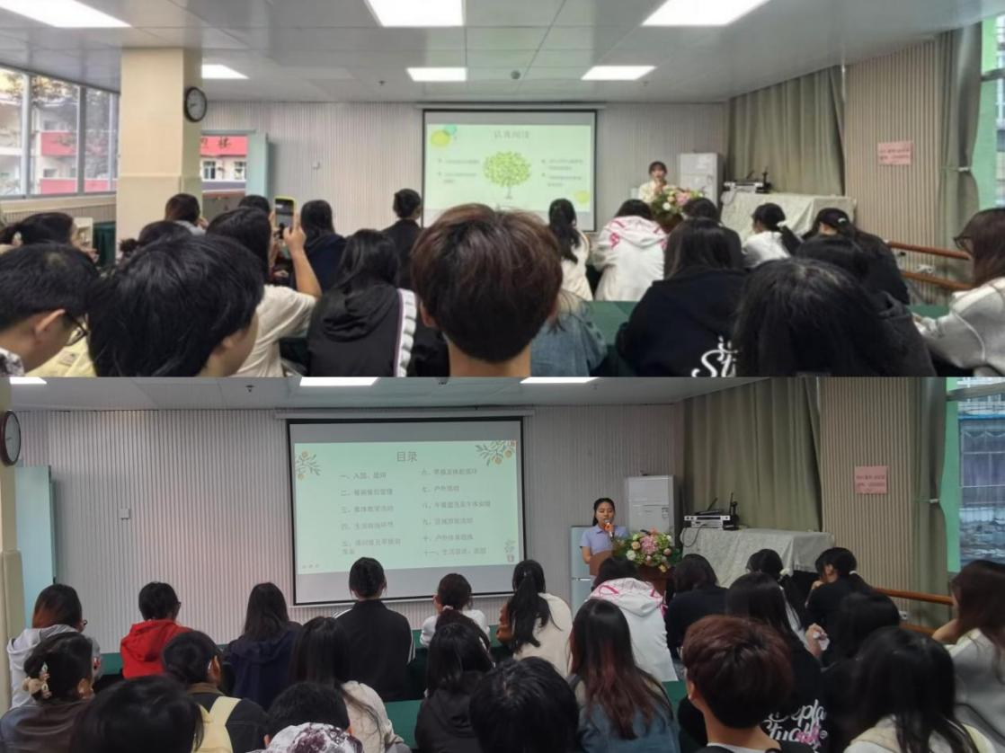 雁山大埠中心幼儿园,园长彭荣荣老师的《培育“乐爱·懂爱·智爱”的幼儿教师》主题讲座,对乐爱、懂爱、智爱的深刻内涵及在幼儿教育中的重要性进行了详细阐述,并结合大埠中心幼儿园的丰富实践案例,深入浅出地讲解了如何将这些理念融入日常教学中,鼓励同学们努力成为新时代优秀的幼教工作者。在随后的互动环节,特别邀请了现就职于大埠中心幼儿园的我校 2019 级优秀毕业生李芳玲老师为同学们答疑解惑。李芳玲老师分享了自己从学生到职场人的成长历程与宝贵经验,同学们积极提问,现场气氛热烈,大家纷纷表示收获颇丰。