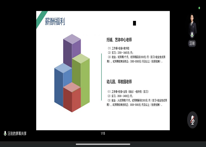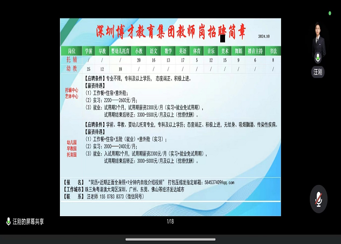 为了进一步帮助小学教育专业学生明确就业方向与前景,一体推进毕业生“实习—就业”工作,10月13日19时,教育学院邀请广东深圳博才教育集团经理汪刚为2021级小学教育专业全体同学开展实习就业宣讲,本次会议在线上开展。
