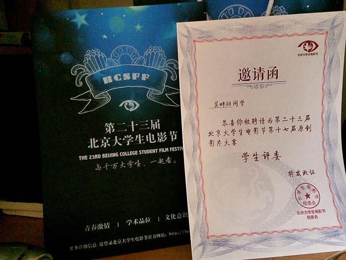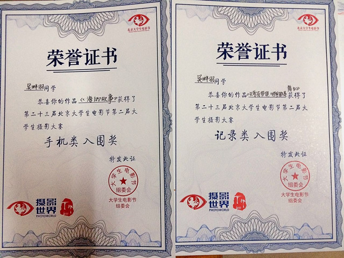 近日,在北京举行的第23届北京大学生电影节落下帷幕,音乐与教育系2013级播音与主持艺术专业学生吴畔羽获得第2届大学生摄影大赛手机类入围奖和记录类入围奖,并受邀担任第17届大学生原创影片大赛的学生评委,为我校学子在此类比赛中的零突破。