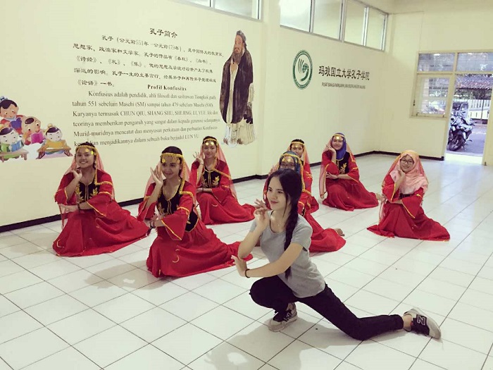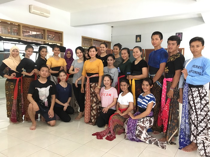 在印尼期间,我系师生分别在玛琅国立大学、玛琅穆罕默迪亚大学开展教学,教授印尼大学生练习中国民族舞蹈和中国民歌。其中,民族舞蹈《好日子》、《壮乡情歌》、《掀起你的盖头来》深受印尼学生喜爱;《半个月亮爬上来》、《送别》等朗朗上口的歌曲也获得印尼学生青睐。同时,我系赴外交流师生还参与了玛琅国立大学文学院音乐及舞蹈系的课程学习,学习印尼地方传统音乐、中爪哇舞蹈、巴厘舞蹈和玛琅舞蹈,通过学习进一步开展音乐学、舞蹈学专业相关调研和文化交流活动。