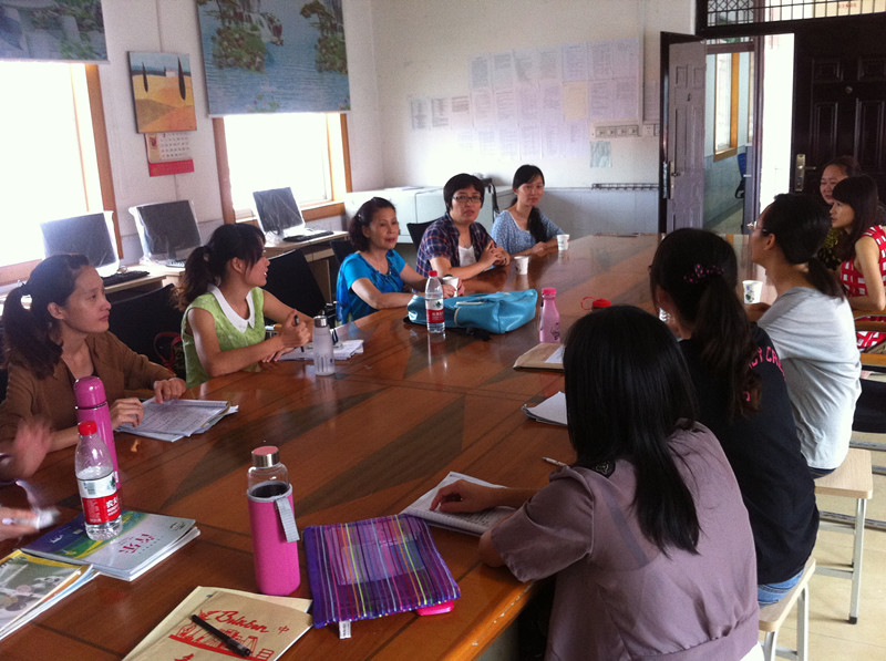 音教系负责人听取桂林市八中副校长(图中)反馈实习情况