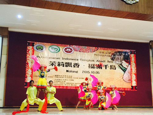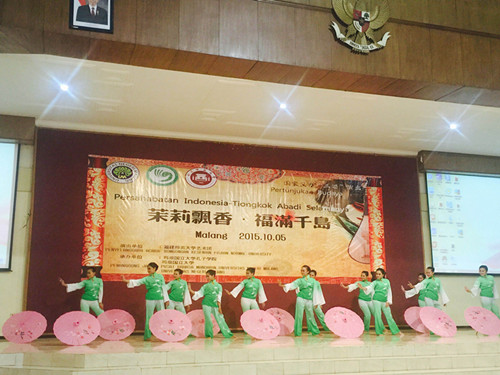 10月5日上午,我院音教系12级声乐舞蹈专业师生参加国家汉办于印尼玛琅国立大学孔子学院举办的茉莉飘香.福满千岛“三巡演出”活动。