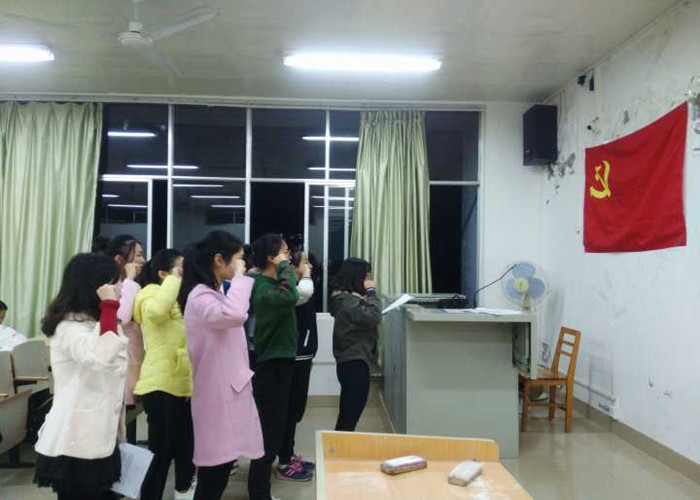大会正式开始前,主持人介绍本次大会议程,并清点到会人数,所有成员按时参加会议,本次会议有效。大会开始第一项全体起立奏国际歌。接着,由本次发展对象谢金芝、陈益灵、李晓、赵路斯、潘澜丹、王海霞、陈思维分别上台向党组织汇报自己一年来在思想、学习、工作、生活等方面的情况。接着每个发展对象的入党介绍人及民主评议人都对7位发展对象各方面的情况作了补充说明,并提出仍存在的不足之处。随后,由党支部正式党员采取无记名投票的方式对此次发展对象进行了投票。最后7位发展对象均以全票通过此次的发展党员,成为预备党员。最后,所有成功发展的预备党员面对党旗郑重宣誓,响亮的声音回荡在教室中,体现出了他们对党的崇高敬意及入党的决心。