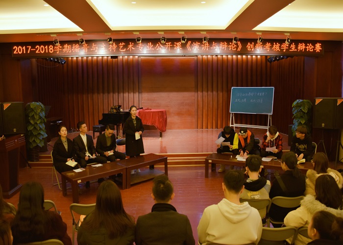 本次课程由王达老师与胡又嘉老师带领2016级播音与主持方向两个大组所对决胜出的四个辩论战队进行最终“冠、亚、季、殿”军的争夺,这四个辩论战队是由各个小班内进行了激烈的角逐而产生的——冠军争夺战队伍,竞赛的制度严谨性和趣味性是本次创新考核的最大亮点。播音与主持艺术专业教研室的老师们群策群力,在小课组这种播音主持专业特有的课堂组织形式的考核方法上的又一创新,充分展现了艺术教学的实践性以及对舞台竞赛形式适应性要求。通过本次活动,使得专业教师与学生一起“动起来”,为一场辩论消得“人憔悴”。每一个学生都要求直接参加到辩论赛中,感受到辩论赛这个激情与严谨并存的特殊的语言竞赛形式。