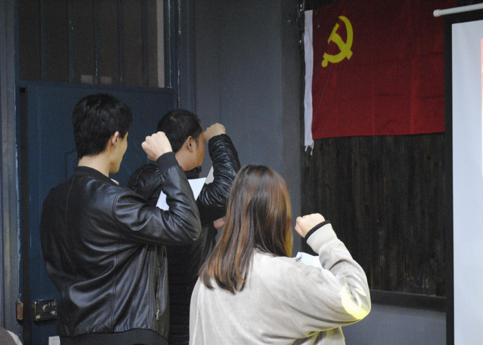 图:系党总支书记刘波带领王若愚同志和王凌璐同志面向党旗庄严宣誓
