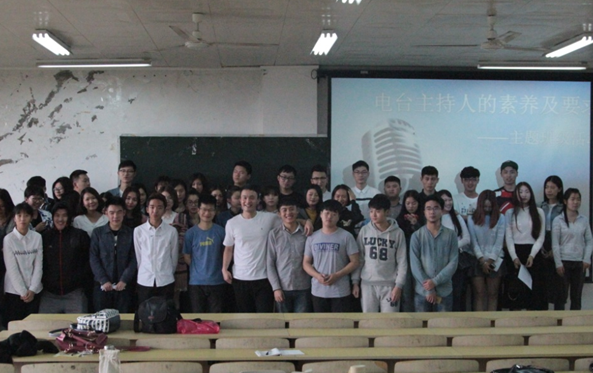 5月8日下午,2013级播音与主持艺术专业在1411教室举办了《电台主持人的要求及素养》座谈会。座谈会邀请到柳州交通广播电台主持人李麟俊主讲,音乐与教育系党总支书记廖莎、中文系党总支副书记钟锟出席座谈会。