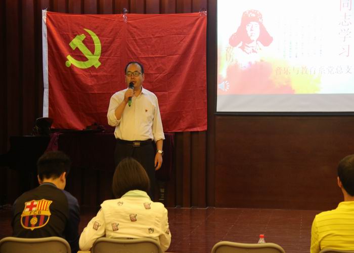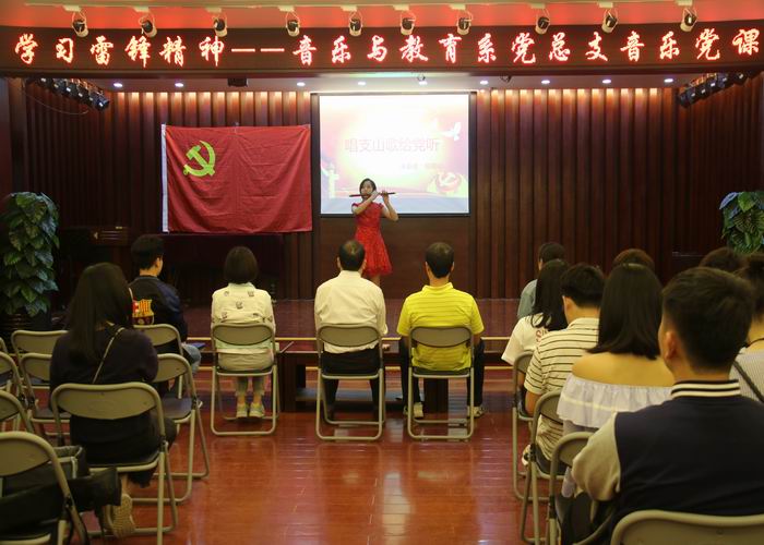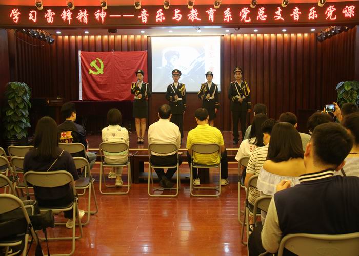 音乐与教育系党总支“音乐党课”继续在特色党课的道路上探索学校思政教育新形式。总支利用音乐与教育系的专业特点,把党课学习内容与舞台文艺表演相结合,烘托时事政治,把“雷锋精神”演绎出来,这既培养同学们专业素养,又能进行生动的思想教育,强调党课教育的感染力。