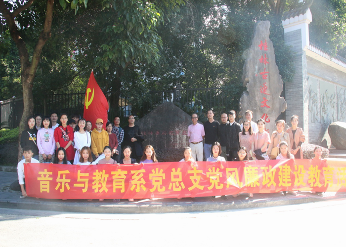 10月31日下午2点,音乐与教育系在桂林市七星区古莲文化街开展党风廉政建设教育活动,参与本次活动的有音乐与教育系全体师生党员。音乐与教育系党总支刘波书记指出此次教育活动的意义,希望通过对先人的廉政思想使我们每个党员同志思想能够紧跟党员身份标准严格要求自己,不管是学生还是老师都要时刻铭记自己党员的身份,时刻想着他人,为他人服务,做到两袖清风,为学院的发展做贡献。