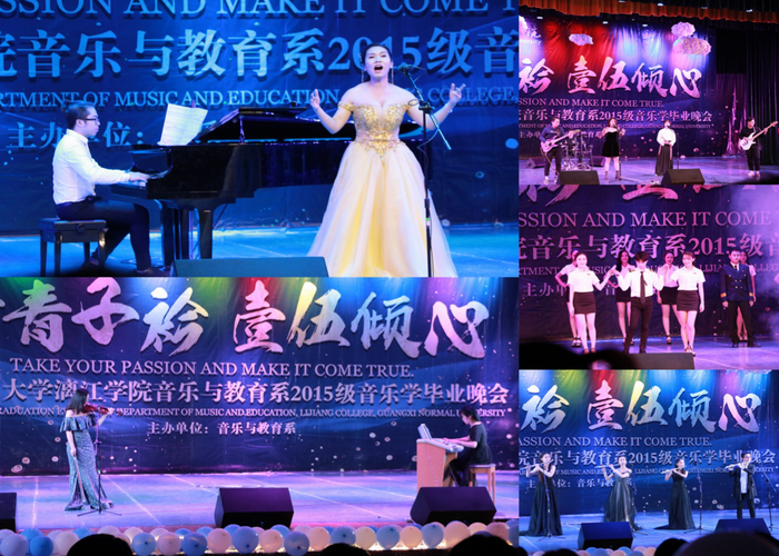 音乐与教育系2015级音乐学、舞蹈学、播音与主持艺术(含广播电视编导方向)、学前教育等四个专业近400名毕业生,用四台精彩的演出,通过独唱、小组唱、大合唱、长笛二重奏、二胡演奏、双排键演奏、独舞、群舞、双人舞、舞蹈技巧、舞台剧、学前美术作品展示、朗诵、配音、电竞解说等多种节目演出形式,全面展现了大学四年的学习成果,展示了扎实的专业技能和全面的艺术才华,受到现场观众的高度称赞。