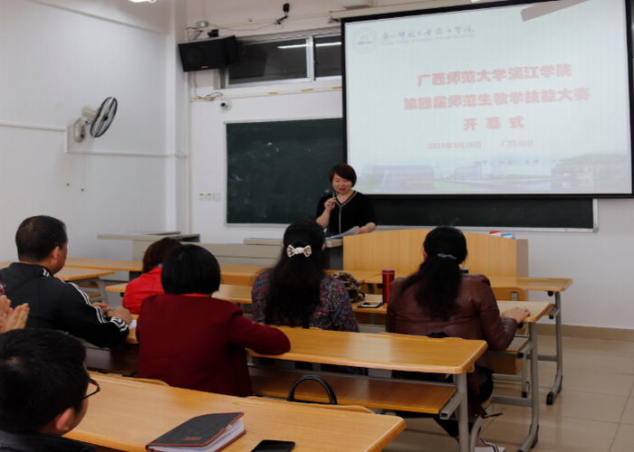 3月29日下午,我校第四届师范生教学技能大赛暨2019年全区师范生教学技能大赛选拔赛在教学楼拉开帷幕。桂林市七星教育局冯嘉莉副局长、桂林市七星教育局调研员(原龙隐集团校长)贺琳老师、桂林市穿山中学梁培华校长、七星幼儿园总园李丽娜副园长、广西师范大学教育学部陶波副教授、桂林八中黄琳老师、桂林八中申金英老师、桂林十一中闫永刚老师莅临我校指导。杨庆庆副校长出席了开幕式、教务与科研处相关负责人、各师范专业所在二级学院领导、相关教研室主任、指导老师以及相关专业学生参加了本次活动。