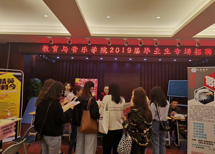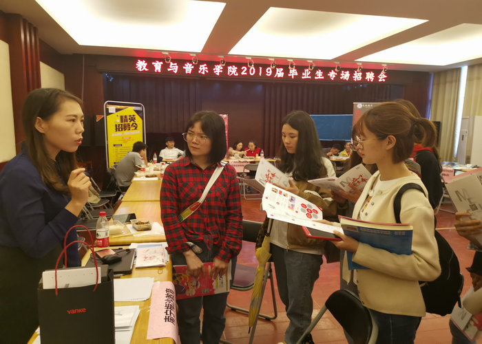 为搭建用人单位与我院毕业生就业双向选择平台,助力我院2015届毕业生更快就业,4月18日上午10点,教育与音乐学院在小音乐厅成功举办2019届毕业生专场招聘会。来自南宁、柳州、桂林等地的9家优质用人单位到校参加招聘,提供幼教、音乐、舞蹈、美术、播音等专业需求的岗位近百个。本次招聘会受到了学院领导高度重视,院长彭超、党总支书记周杰莅临现场与用人单位交流,党总支副书记熊云云全程参与并细心指导学生进行应聘。