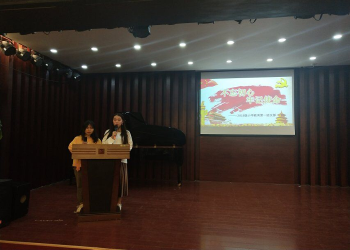 活动初始,团支书汤钰、副团支书张沥月作为主持人宣布活动开始,宣读了本次活动的目的和意义,全体师生齐唱团歌,给本次活动营造热烈的氛围。在本次活动中,18级小学教育第一团支部通过知识问答调动支部成员的积极性;表演小品《为人民服务》让同学们深入感受党的初心和使命;展示“不忘初心、牢记使命”手工制品介绍和观看入党积极分子做公益视频来表达团支部成员对党的忠诚和热爱。活动最后由辅导员王邓老师总结发言,与同学们分享本次活动的感悟,要求同学们紧跟党的脚步,努力拼搏,不断进取。为建设中国特色社会主义事业奉献自己的一份力量。