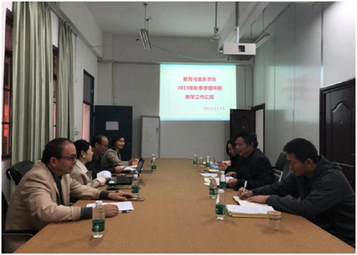 在6241会议室,彭超院长向检查组一行做了以“教学为中心”的主题汇报,详细介绍了我院本学期以来师资队伍建设、日常教学活动的开展、毕业实习和毕业论文的进展、“全员课程思政”等工作推进情况,转达了我院在开展教学自查期间对课程任课教师、教学设备等方面的建议和意见。同时,就我院目前教学工作中存在的困难,如实训室管理、琴房设备维护更新、外聘教师管理和部分专业师资不足等问题进行了沟通和探讨。