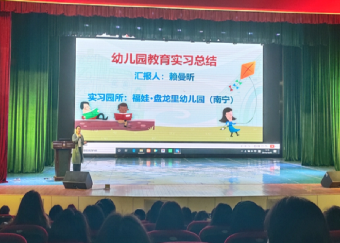 会上,分别在广西军区幼儿园、广西桂林市西城路幼儿园、广西南宁福娃幼儿园、福建厦门市五缘实验幼儿园实习的四位优秀实习生代表分别从幼儿园简介、幼儿园课程特色、实习负责的工作、收获与感悟四个方面做了介绍。四个幼儿园有公立和私立的,有省内和省外的,各具特色。四个实习生代表通过4个月的实习,他们对幼儿园的教育工作有了一定的了解,具备了初步的环境创设能力、游戏活动设计的能力、课堂教学组织能力,进一步地提高了他们理论与实践相结合的水平,对教师职业的特点与教师应具备的素养有了深刻的认识。