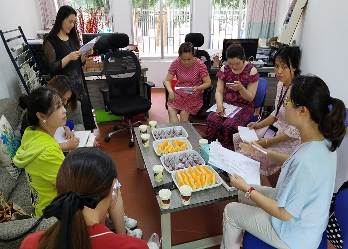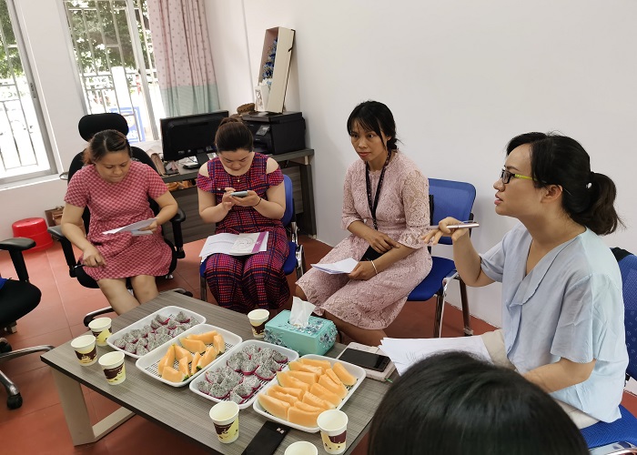 下半场由学前教育专业教师协助七星幼教集团研讨音乐教育园本活动方案的开发,即如何将奥尔夫音乐教学法、歌唱活动与七星幼儿生活主题相联系,发展出具有七星幼儿园特色的原本音乐活动。学前专业的教师从音乐、言语能力等方面给了建议,双方在讨论中生成了具有创新性的思路。