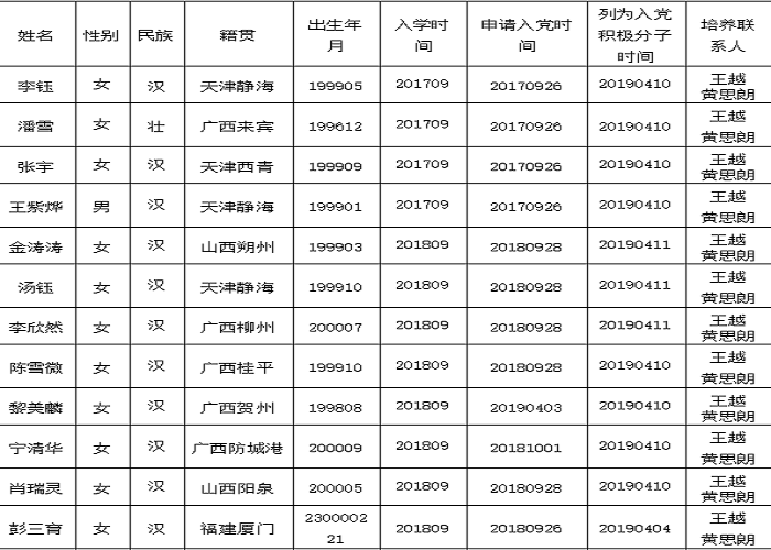 经支部委员会研究同意,将李钰等18位同志列为发展对象人选。根据发展党员工作有关要求,现将其有关情况公示如下: