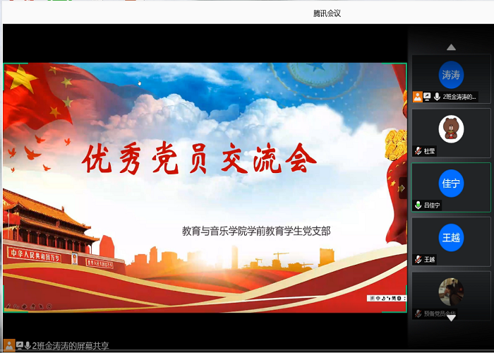 2020年6月10日中午,教育与音乐学院学前教育学生党支部成员在腾讯会议(线上)开展了优秀党员交流会党日活动。目的是为进一步加强党员之间的交流与了解,党员明确初心,端正入党动机,明确自己的责任所在以及人生方向。