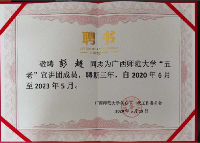 2020年6月19日,我校教育与音乐学院院长彭超教授获聘广西师范大学“关心下一代委员会”“五老”宣讲团成员。广西师范大学“关心下一代委员会”是在校党委领导下、以离退休老同志为主体、有在职同志参加的群众性工作组织。主要任务是组织、指导教育系统离退休老同志,配合教育部门和学校,全面贯彻党的教育方针,着力对高校和中小学校学生以及青年教职员工进行思想政治和道德品质教育,全面关心青少年健康成长,为培养德智体美全面发展的中国特色社会主义事业建设者和接班人服务。