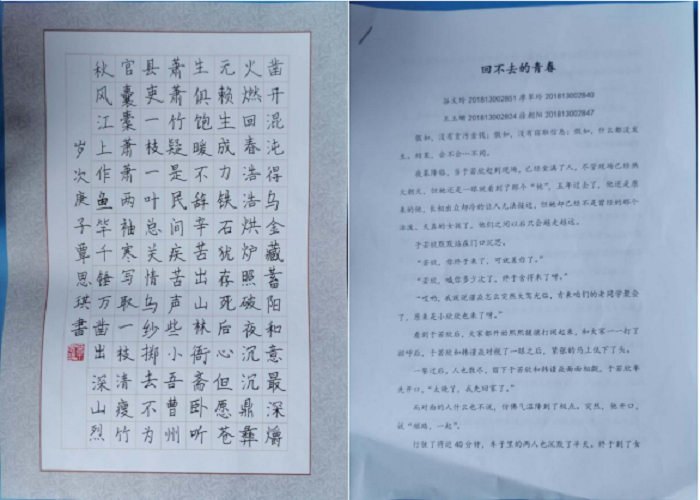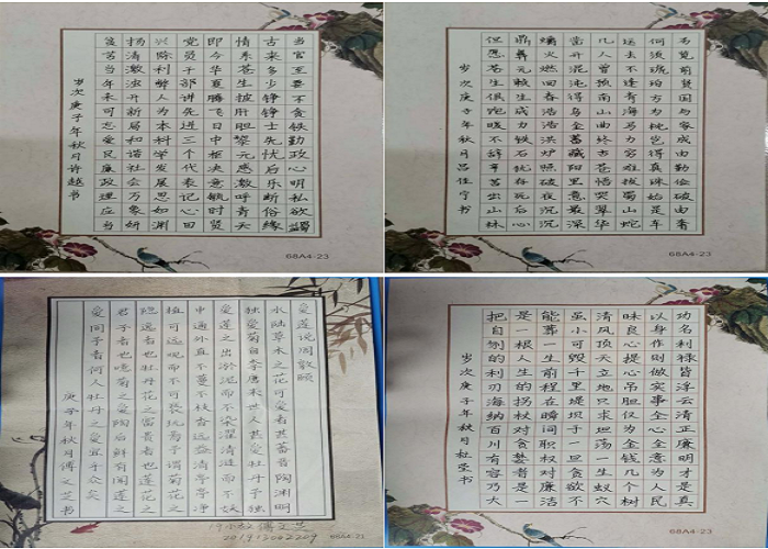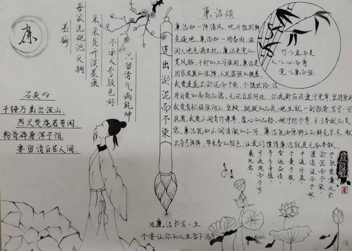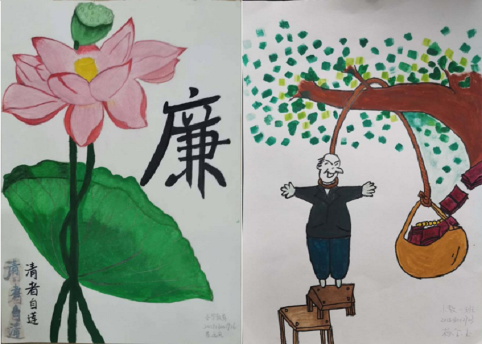 “同学,这是你们廉洁文化作品创作大赛的参赛作品吗?太漂亮了,既符合活动主题,又彰显我们校园文化特色。”这是送往8029办公室途中,看到参赛作品的老师说。此次收到39名师生的参赛作品共32件,其中教师作品6件,学生作品26件,作品类别涵盖曲艺文学类、书画摄影类、诗词楹联类。