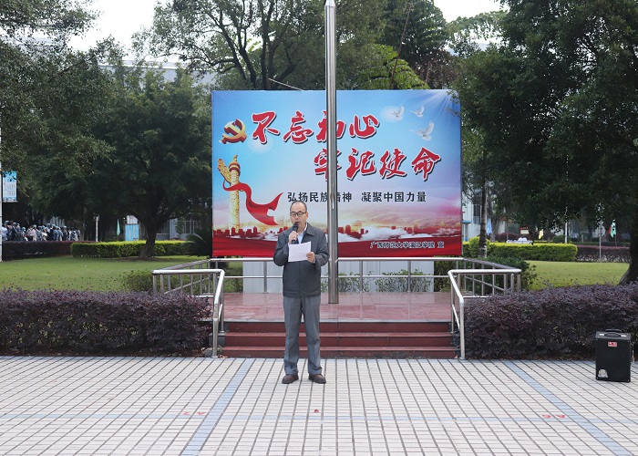 升旗结束后,教育与音乐学院周杰书记在国旗下做“大学,一场美丽的青春旅程”为主题的重要讲话。他讲到,在新中国七十一周年国庆的喜悦下,2020级新生们的到来,给校园增添了青春的气息和活力,祝愿同学们在新的学年,展现新的风采,开拓新的境界,追求新的目标,开启一场青春之旅。在这场青春之旅中,如何如何让它成为一种动力、成为一种积累、成为一种阶梯?